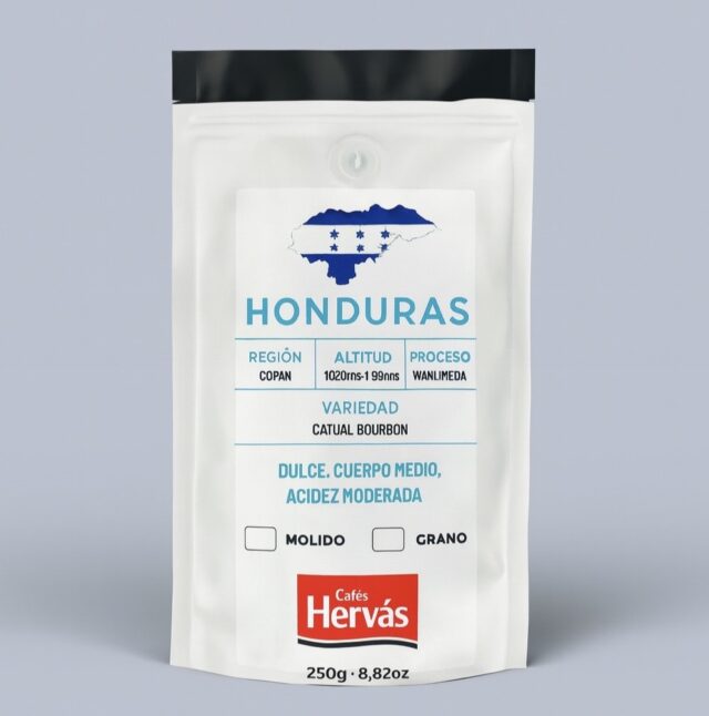 Envase tipo Doypack con abre-fácil y cierre zip resellable. Contenido neto de 250 grs. de café arábica de tueste natural 100%. Indicando lote, consumo preferente y ficha nutricional de producto.