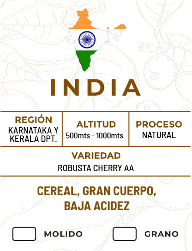 Café 100% variedad robusta. India Cherry AA. Criba 18.